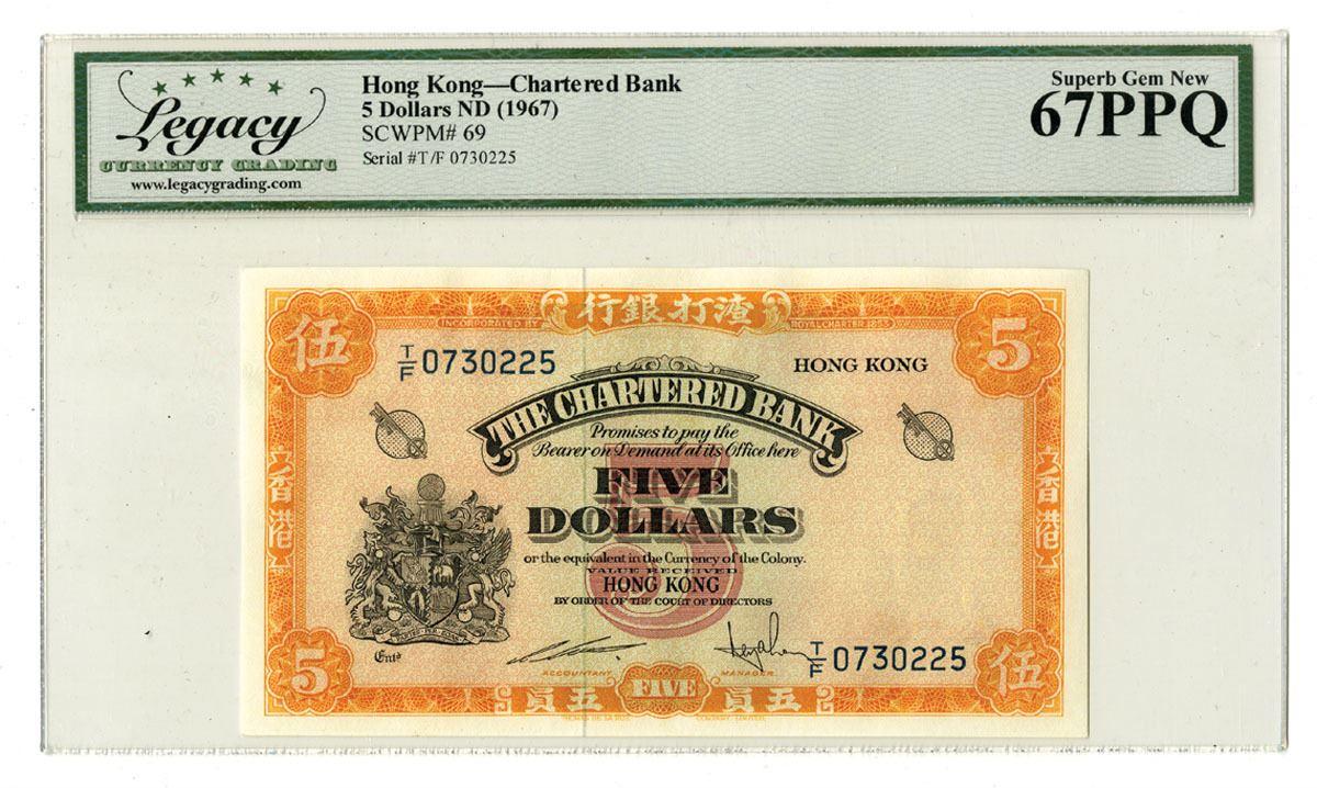 Hong Kong, ND (1967). 5 Dollars, P-69 KNB45a, Issued Banknote, Black and yellow-brown on m/c underprint with arms at lower left, Back is orange with junk and sampan at center, S/N T/F 0730225, Legacy graded Superb Gem New 67 PPQ, TDLR.