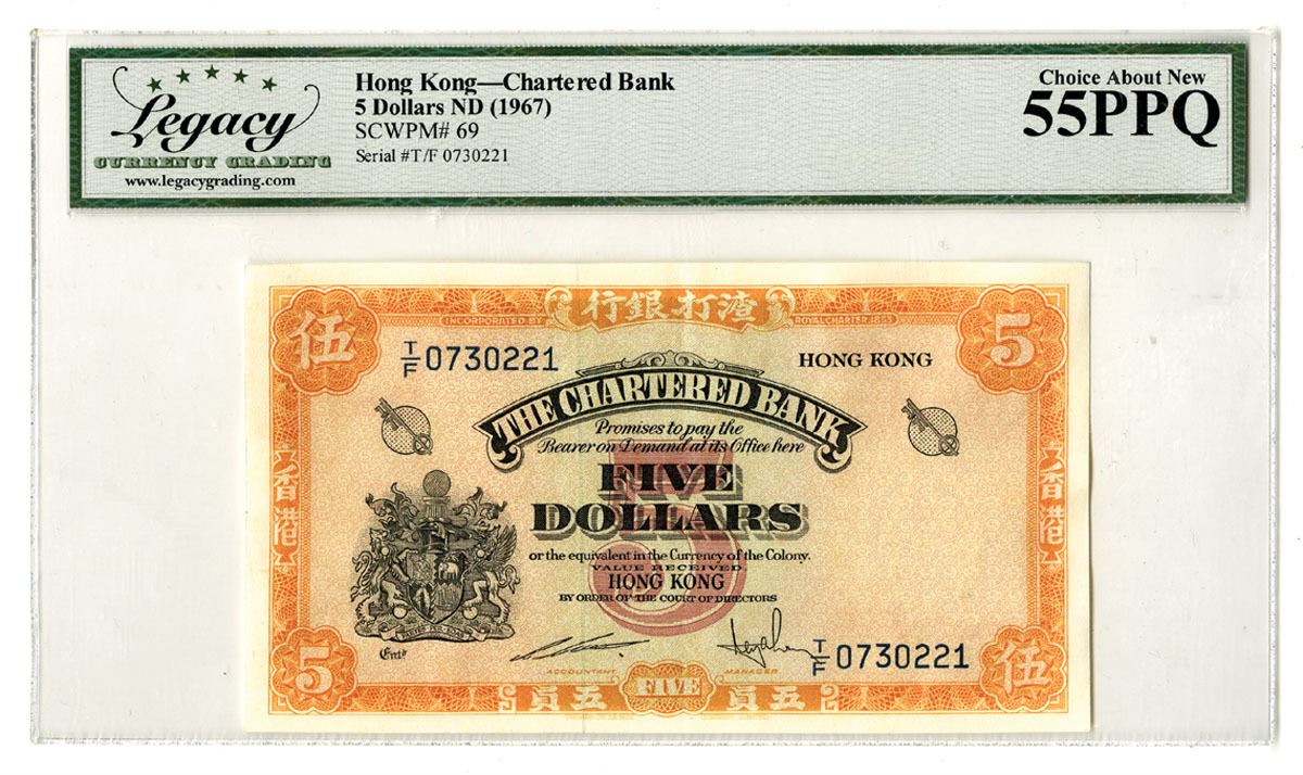 Hong Kong, ND (1967). 5 Dollars, P-69 KNB45a, Issued Banknote, Black and yellow-brown on m/c underprint with arms at lower left, Back is orange with junk and sampan at center, S/N T/F 0730221, Legacy graded Choice About New 55PPQ, TDLR.