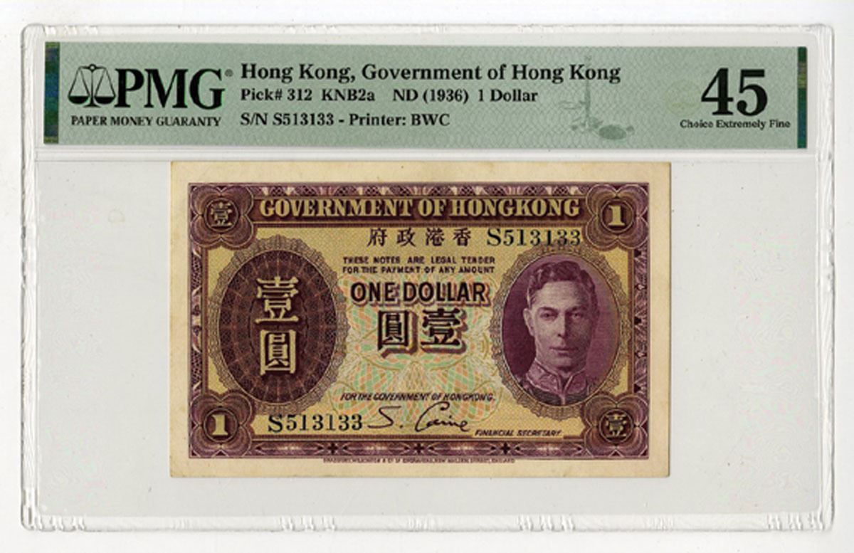 Hong Kong, ND (1936). 1 Dollar, P-312 KNB2a, Issued Banknote, Purple on m/c underprint with portrait of King George VI at right, S/N S513133, PMG graded Choice Extremely Fine 45, BWC.