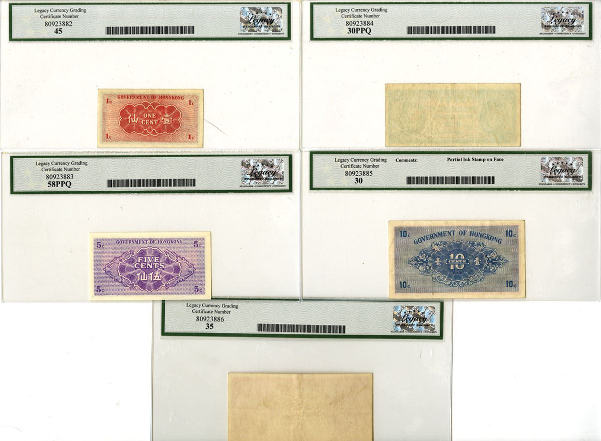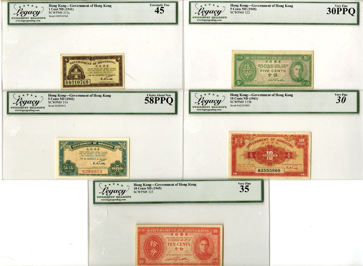 Hong Kong, ND (1941-45). Lot of 5 Issued Banknotes, Includes: 1 Cent, P-313c, ND (1941), S/N B0910769, Legacy graded Extremely Fine 45; 5 Cents, P-314, ND (1941), S/N 6289912, Legacy graded Choice About New 58PPQ; 10 Cents, P-315b, ND (1941), S/N A2555895, Legacy graded Very Fine 30 with comment "Partial Ink Stamp on Face;" 5 Cents, P-322, ND (1945), Legacy graded Very Fine 30PPQ; 10 Cents, P-323, ND (1945), Legacy graded Very Fine 35. (5). Sold "AS IS" no returns accepted.