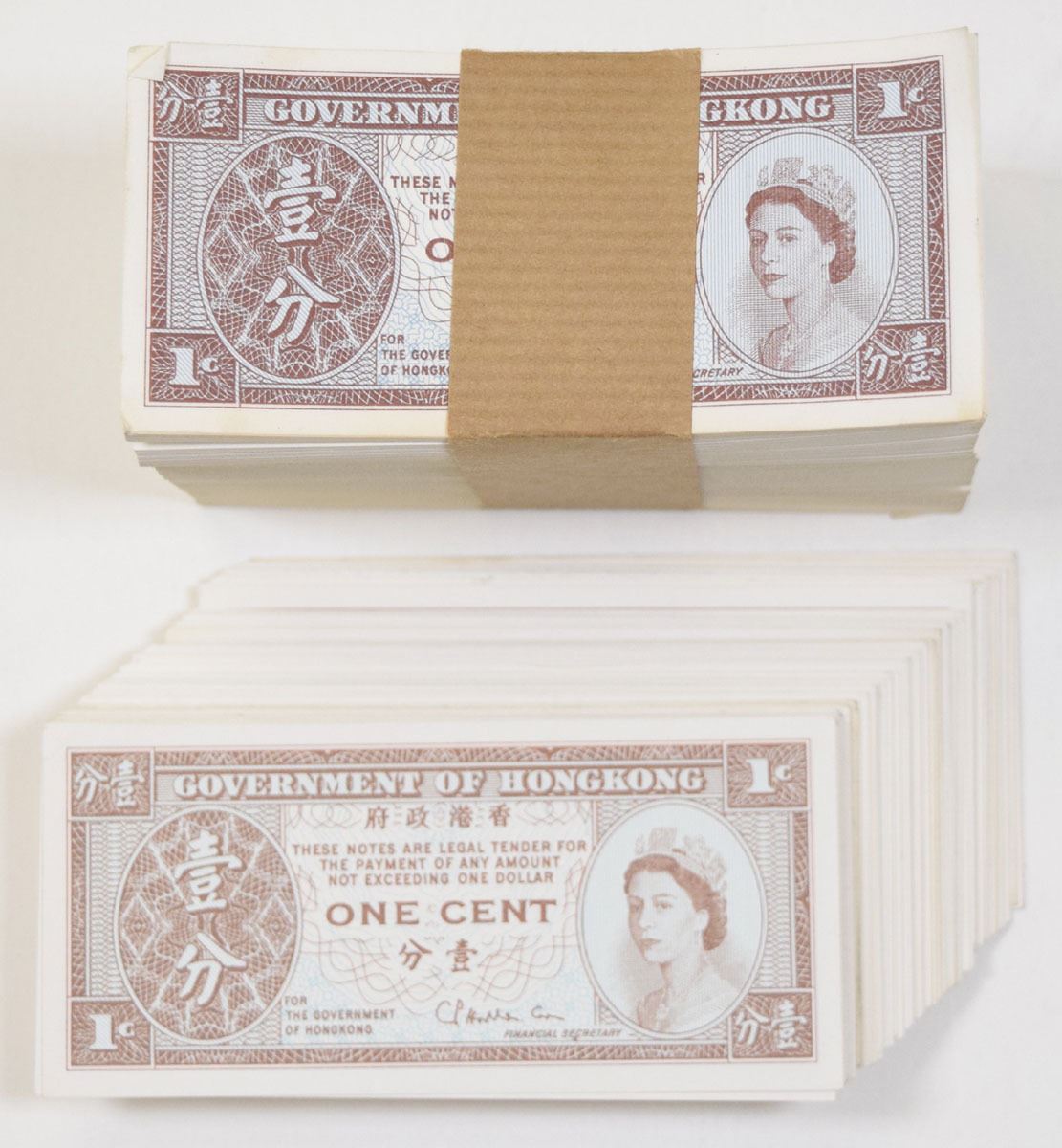 Hong Kong, ND (1961-81). Lot of 450+, 1 Cent, P-325a and P-325b Issued Banknotes, Brown on light blue underprint with Queen Elizabeth II at right, Notes are in AU to UNC condition. (450+) Sold "AS IS" no returns accepted.