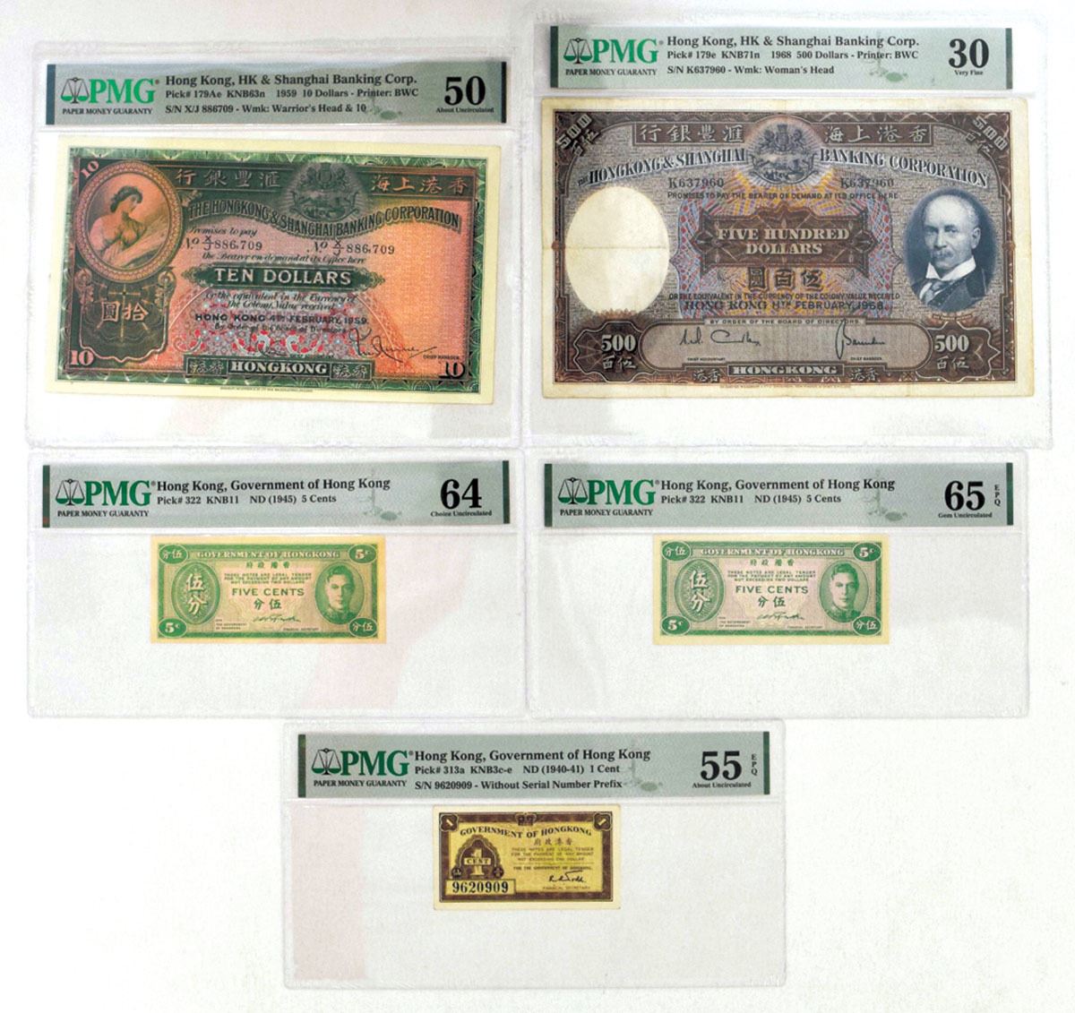 Hong Kong, ND (1940)-1968. Lot of 5 Issued Banknotes, Includes: Government of Hong Kong, ND (1940-41), 1 Cent, P-313a KNB3c-e, S/N 9620909, PMG About Unc 55 EPQ; ND (1945), 5 Cents, P-322 (2) KNB11, Both are PMG graded, First is Choice Unc 64 and other is Gem Unc 65 EPQ; Hongkong & Shanghai Banking Corp. 1959, 10 Dollars, P-179Ae, KNB63n, PMG graded About Uncirculated 50, BW& C; 1968, 500 Dollars, P-179e KNB71n, PMG graded Very Fine 30, BWC. (5). Sold "AS IS" no returns accepted.