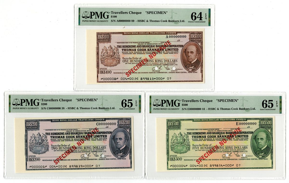 Hong Kong, ND (1980s). Lot of 3 Specimen Traveler's Cheques, Includes: 100 Hong Kong Dollars, S/N A00000000 89, PMG Choice Unc 64 EPQ; 200 Hong Kong Dollars, S/N C00000000 38, PMG Gem Unc 65 EPQ; 500 Hong Kong Dollars, S/N E00000000 44 , PMG Gem Unc 65 EPQ. All have Specimen overprints and POCs. (3). Sold "AS IS" no returns accepted.