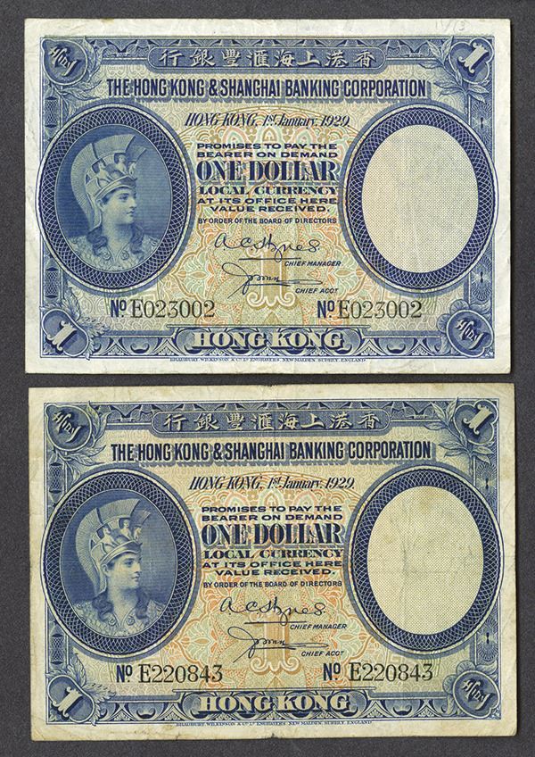 Hong Kong. 1 Dollar. P-172b (2). 1.1.1929. Helmeted female bust at left. Very Fine, one choice. 2 pieces.