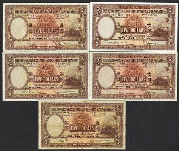 Hong Kong. 5 Dollars. P-173e (2); 180a 1954, b (2). Very Fine to Choice; the 1954 is Choice About Uncirculated. 5 pieces.