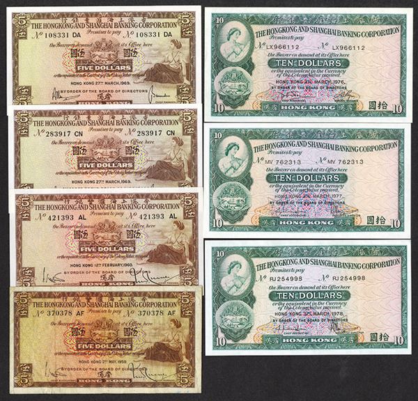 Hong Kong. 5, 10 Dollars. P-181a (2, one VF one EF), ca.27.3.1969 (2); 182g 31.3.1976, h 1977, 1978. All Choice Uncirculated or better except where noted. 7 pieces.