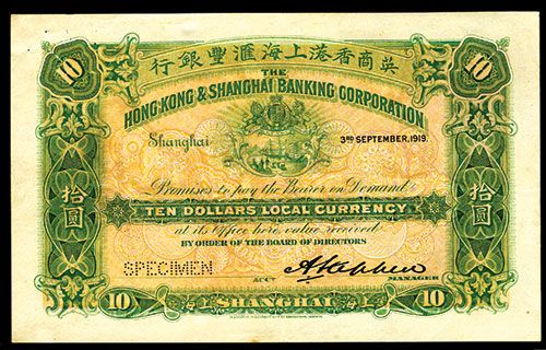 Shanghai, China, 3rd September, 1919. $10, P-S357A (S/M#Y13-32)Unlisted Specimen, Lime green on peach and m/c underprint, Without TEN in underprint, Arms in center, back maroon, Pin-punch SPECIMEN overprint in left signature block, One printed signature in black, 6 small pin holes on the upper left corner, the note has a small corner bend on the top right corner tip, one extremely light center vertical fold in the middle and slight handling that relegates this lovely note to Choice XF to AU condition. BWC.