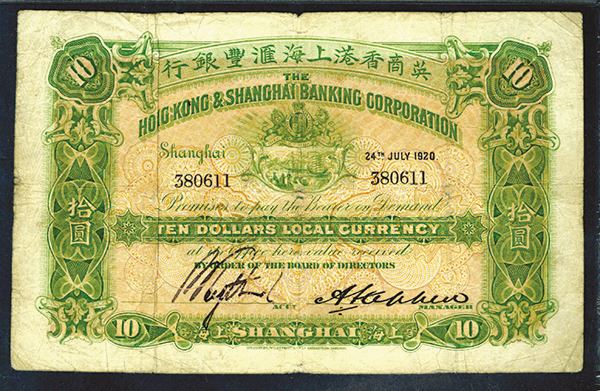 Shanghai, China. 24th July 1920, $10, P-S357A, (S/M #Y13-32). Issued banknote. Green on red underprint, back is maroon. Serial # 380611. PMG graded Very Fine 20 with notation of minor edge splits. Scarce and attractive banknote. BW&C.