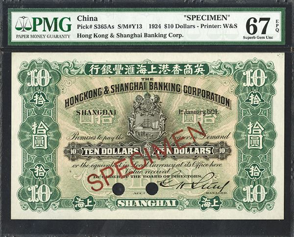 Shanghai, China. 1st January 1924, $10, P-S365As, S/M#Y13-, Unlisted as a Specimen banknote, Green and black on m/c with "TEN" underprint at lower center, Bank arms at top center with facing lion and unicorn, back green and black with bank building at center, No serial numbers, Printed signature at right, 2 Punched out cancels at bottom and large red SPECIMEN overprint, PMG graded Superb Gem Uncirculated 67 EPQ, The only one graded in the PMG census. BWC.