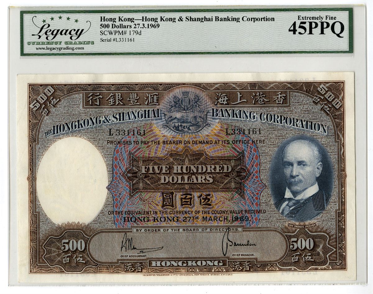 Hong Kong, 27th March, 1969, $500, P-179d, Issued banknote, Brown on m/c, S/N L331161, Legacy graded 45 PPQ. BW&Co.