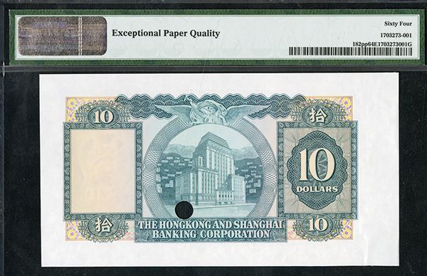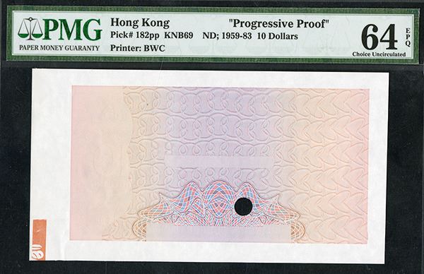 Hong Kong, 10 Dollars, P-182pp, KNB69, progressive proof by BWC featuring a complete back and a multicolor underprint on the front, PMG graded Choice Uncirculated 64 EPQ. BWC.