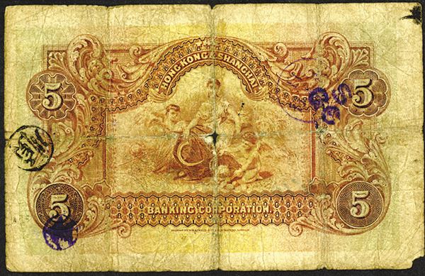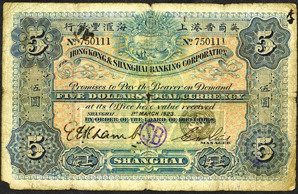 Shanghai. 1st March, 1923. $5. P-S353. Issued banknote. Blue on m/c. "Five" undertint in middle. Chop marks on back. VG condition with 2 small holes in body of note, attractive example of this relatively scarce note. BW&C.