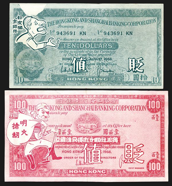 Hong Kong, Lot of 2 notes, Includes $10, Green, man begging on left and $100, Red, with pirate holding sack filled with money, Chinese text on front and back. Issued in 1967 during the riot . The reverse headline reads "Down with the H.K. British for robbery of people and property", The content text has "Inflation of H.K. currency is caused by H.K. British Imperialism....British Fascist is shown...", the obverse of the $10 note reads "white skin pig money eater" and the $100 obverse reads "To rob openly". Things have changed over the last 40 years. Curious and scarce propaganda notes.
