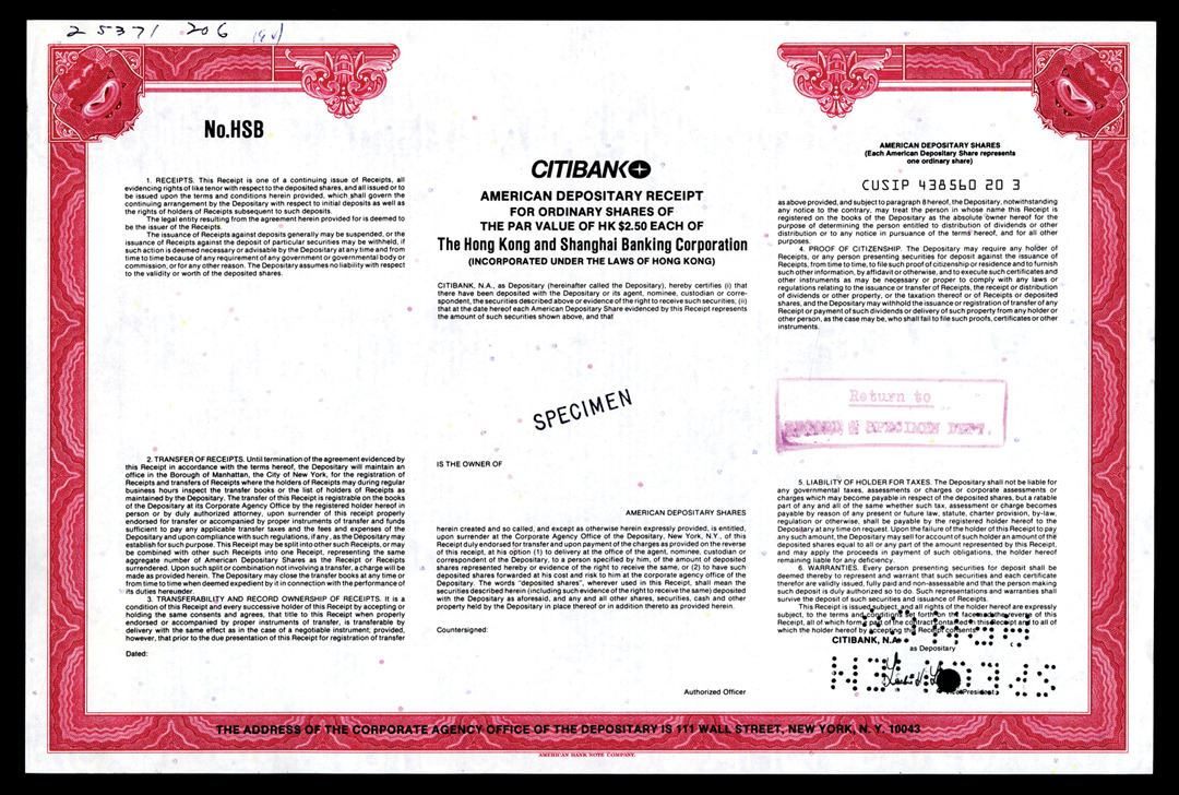 Hong Kong, ca. 1990s. Odd Shares Specimen ADR Stock Certificate, Black text with red border, Citibank logo at top center. Specimen POCs, Return to Record & Specimen Dept. handstamp at left, Pin-punch specimen overprints. VF condition, ABNC. The Hongkong and Shanghai Banking Corporation Limited, commonly known as HSBC, is the Hong Kong subsidiary of multinational bank HSBC. The largest bank in Hong Kong, HSBC operates branches and offices throughout the Indo-Pacific region and in other countries around the world.