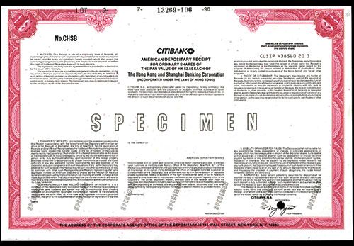 Hong Kong, ND (ca.1960-70's), Odd Shares, Par Value of HK Specimen American Depositary Receipt, black with red border, Issued by Citibank in the U.S., Specimen overprints, POC's, Par value $2.50 each, AU-Uncirculated, Rare. ABNC