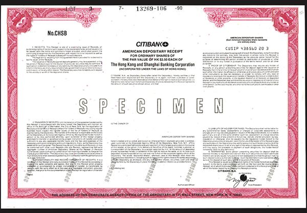 Hong Kong, ND (ca.1960-70's), Odd Shares, Par Value of HK Specimen American Depositary Receipt, black with red border, Issued by Citibank in the U.S., Specimen overprints, POC's, Par value $2.50 each, AU-Uncirculated, Rare. ABNC