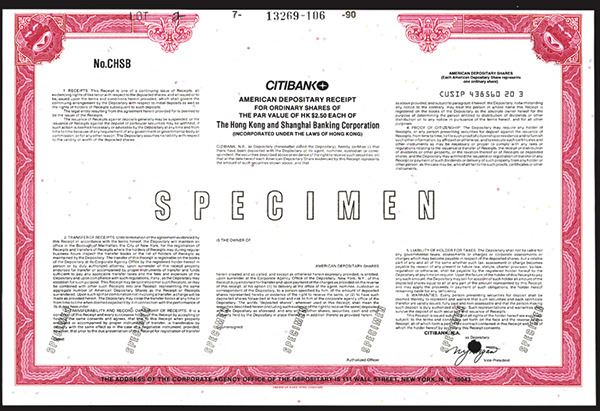 Hong Kong, ND (ca.1960-70's), Odd Shares, Specimen American Depositary Receipt, black with red border, Issued by Citibank in the U.S., Specimen overprints, POC's, Par value $2.50 each, AU-Uncirculated, Rare. ABNC