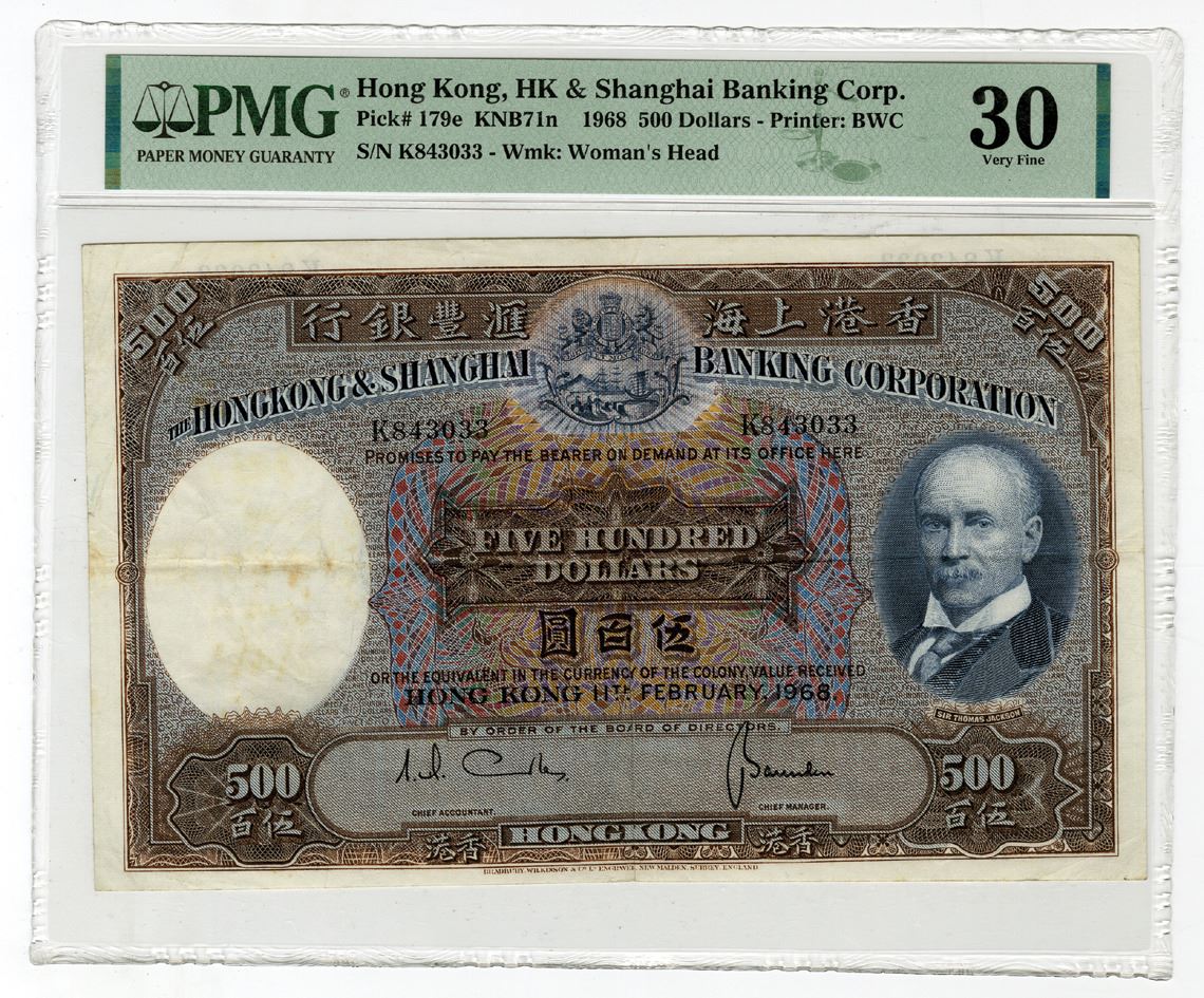 Hong Kong, 1968. 500 Dollars, P-179e KNB71n, Issued Banknote, Navy blue and brown on m/c underprint with portrait of Sir Thomas Jackson at right, Back is blue with bank building at center, S/M K843033, PMG graded Very Fine 30, BWC.