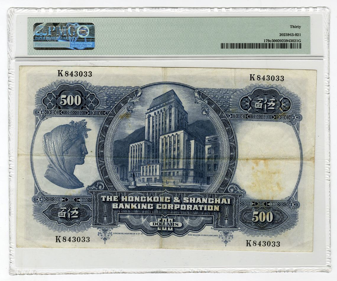 Hong Kong, 1968. 500 Dollars, P-179e KNB71n, Issued Banknote, Navy blue and brown on m/c underprint with portrait of Sir Thomas Jackson at right, Back is blue with bank building at center, S/M K843033, PMG graded Very Fine 30, BWC.