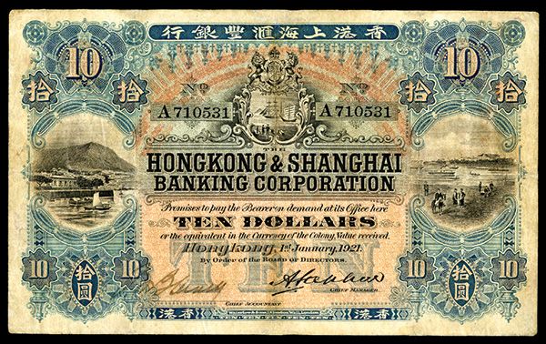 Hong Kong. 1st January 1921, $10, P-167, Issued banknote, blue on red underprint, waterfront at left, horseman and walkers right, 1 hand signed and 1 printed signature, back dark brown with olive green border, S/N A710531, VF condition with large even margins, no pin holes and very attractive for issue. W&S.
