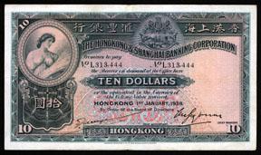 Hongkong. 1st January, 1938. $10, P-178a., issued banknote. Green on m/c with allegorical woman on upper left, back green and m/c with 4 serial numbers on top and bottom margins. Note appears VF+ with crisp clean paper, great colors and good corners that on first appearance gives the impression of XF to XF+ condition. BWC. Great example of this earlier issue from this series.