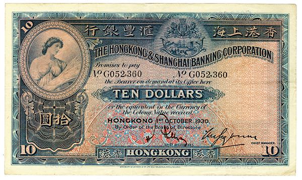 Hongkong. 1st October, 1930. $10, P-178a., Issued banknote. Green on m/c with allegorical woman on upper left, back green and m/c with 4 serial numbers on top and bottom margins. 1 Printed signature and 1 handwritten signature, Note appears VF with great colors and sharp corners that on first appearance gives the impression of XF condition. BWC.