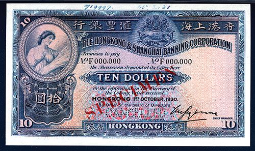 Hong Kong, 1st October, 1930, $10, P-178as, Specimen banknote, Green on m/c, Specimen overprint and pin-punch Specimen, S/N F000,000. 4 Serial numbers on the back, the usual archival notations on top margin, PMG graded Gem Uncirculated 66 EPQ. Amazing first issue note in superb grade that will be difficult if not impossible to improve upon. BWC.