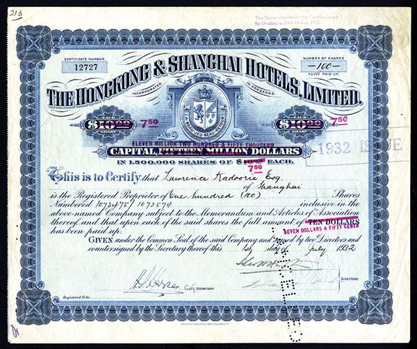 Hong Kong, China, 100 Shares, I/C, Arms of hotel, blue border and text, VF condition. W&S. Scarce and attractive.
