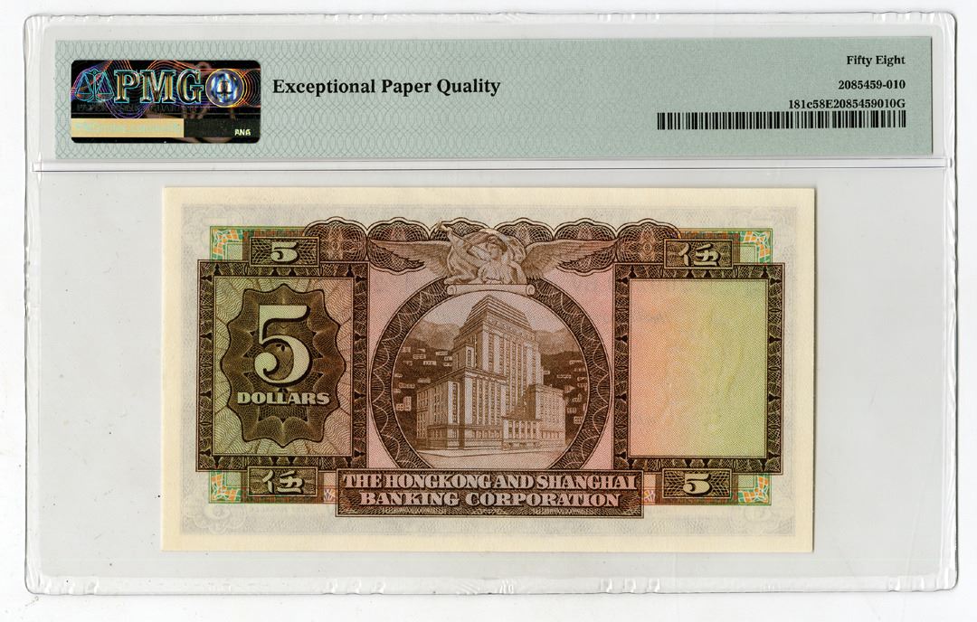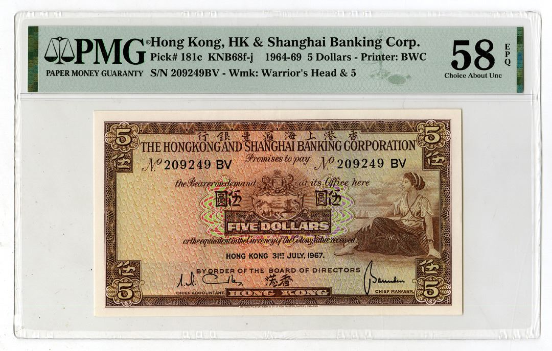 Hong Kong, 1964-69. 5 Dollars, P-181c KNB68f-j, Issued Banknote, Brown on m/c underprint, Reclining woman at right, S/N 209249BV, PMG graded Choice About Unc 58 EPQ, BWC.