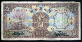 Lot of 4 notes. Includes 3 different Bank of Hopei and a single Provincial Bank of Hopei. Lot includes 1929, 10 Cents, P-S1711 (S/M #H64-1), Fine to VF; 1934, 5 Yuan, P-S1731a (S/M #H64-42a), Fine+; 1934, 5 Yuan, P-S1732 (S/M #H64-43a), Fine+; Provincial Bank of Hopei, 1933, 10 Yuan, P-S1725a (S/M #H64-22a), brown and m/c, VG+ to Fine. Useful assortment of scarce Hopei Provincial banknotes.
