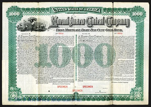 Cuba and New Jersey, 1890, $1000, 1st Mortgage 8% Gold Specimen Bond, Coupons attached, Horizontal format, Black on green border and underprint, Men carrying sugar cane from field top left, POC's, Fine condition with tears where folding occurred, ABNC.