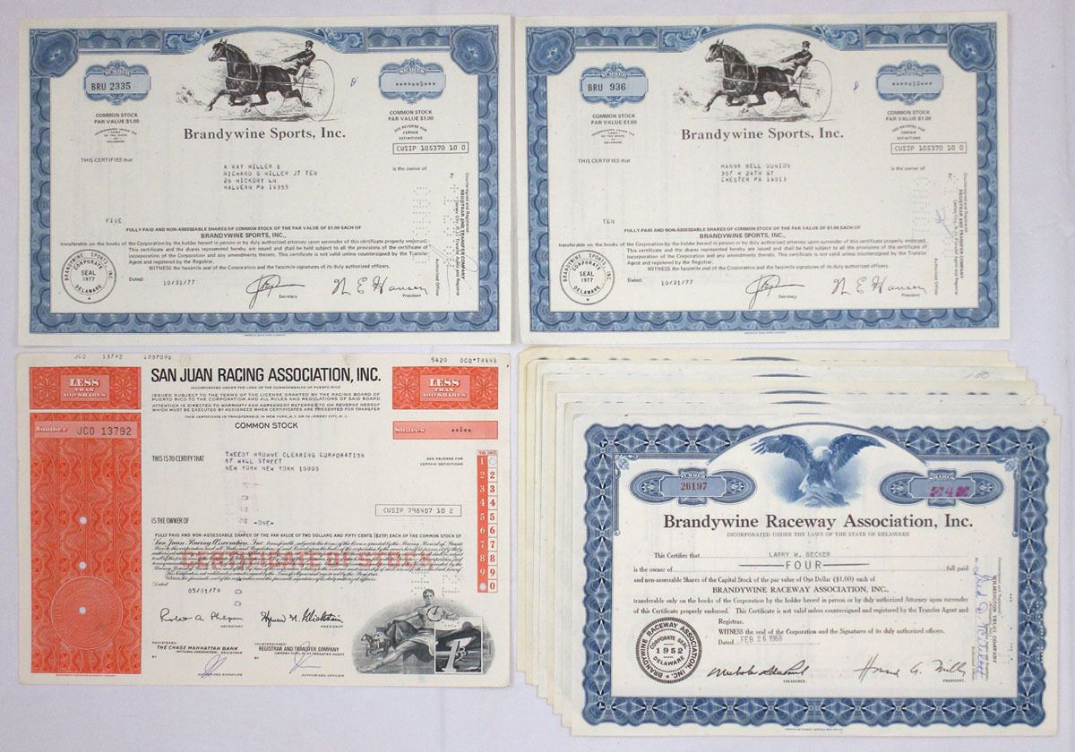 Lot of 11 Issued Stock Certificates related to horse racing, racetrack ownership, and sports operations. Includes: Brandywine Sports, Inc.; San Juan Racing Association, Inc.; and Brandywine Raceway Association, Inc. Certificates feature engraved sporting vignettes, horses in motion, and period corporate design styles. Conditions range from VF to XF overall, with routine folds, punch cancellations, and light handling consistent with issued examples. (11). Sold "AS IS" no returns accepted.