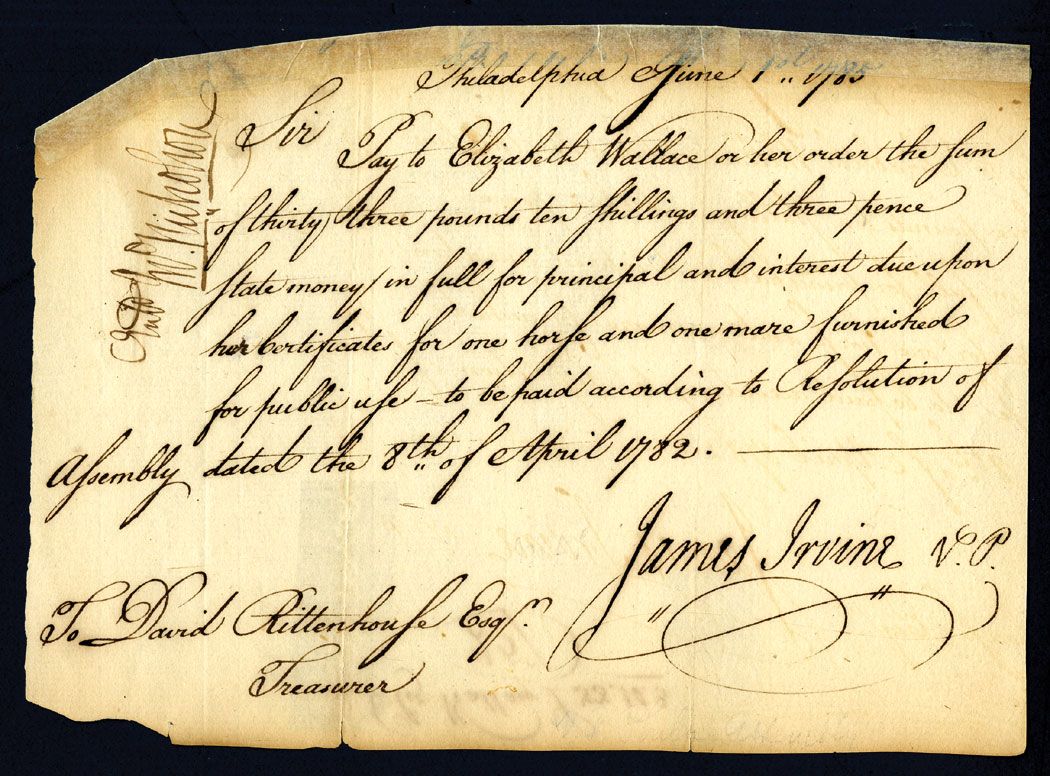 Payment for "one horse and one mare" given for public use, £ 33.10.3, June 1, 1785 likely in return for a Horse Bond. VG with hinge repair on rough top margin, toning, still scarce.