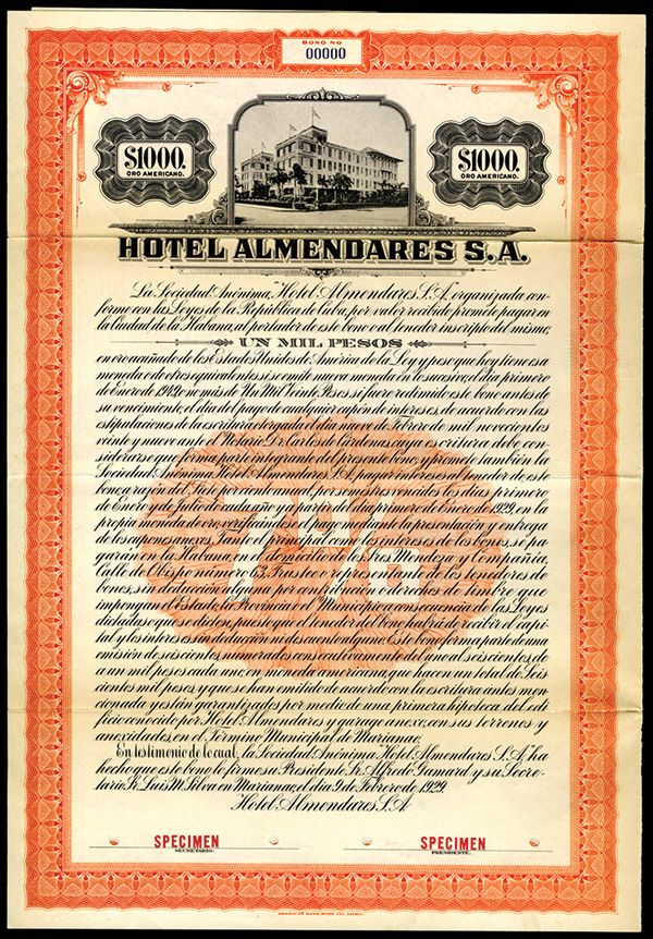 Hotel Almendares $1,000 Specimen Bond. 1929. Havana, Cuba. 1929. $1,000 Specimen Bond, Red border, hotel, EF, edge tear, ABNC. In the 1920's this was advertised as "the most exclusive hotel in Havana."