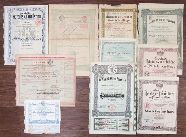 France...., 1880-1927. Lot of 10 I/U French Bonds, Includes 1880, Canal Interoceanique de Panama; 1934, Societe Hoteliere & Immobiliere de Chatelaillon-Plage; 1909, Chemin De Fer De L'Equateur; and others. Condition varies from Fine to XF condition. (10). Sold "AS IS" no returns accepted.