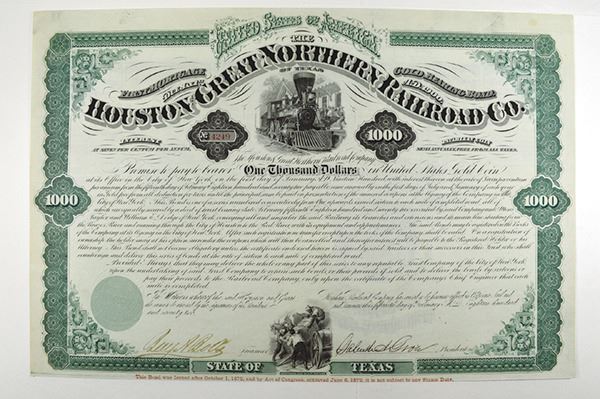 Texas. $1000 Gold Coupon Bond. I/U. Very nice large format. Very Fine+.