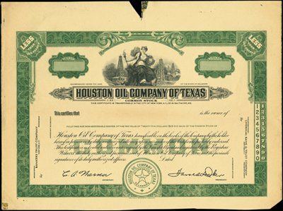 DE. 1954-1955. Production file for common stock certificates. All have vignette of allegorical woman seated between oil wells. 1). < than 100 shs, green. Proof on light brown paper with large margins. 2). Proof on white paper of vignette, title and text without denomination or border. 3). < than 100 shs, orange. Speicmen. 4) Odd shs, brown. Specimen. 5). Miscellaneous correspondence and order forms (3 items). SBNC. Choice group.
