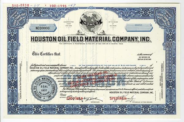 Delaware. <100 Shares Common Stock Specimen Certificate, Black print on blue border and under tint, Globe with company logo on it at top, Specimen overprints and POC's, Also stamped with company name change to International Systems & Controls Corp., VF-XF condition, ABNC.