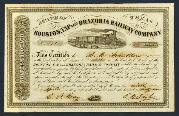Texas. 2 Shrs Stock Certificate. Issued, uncancelled. Light ink burn. Rare as an issued bond. VF+