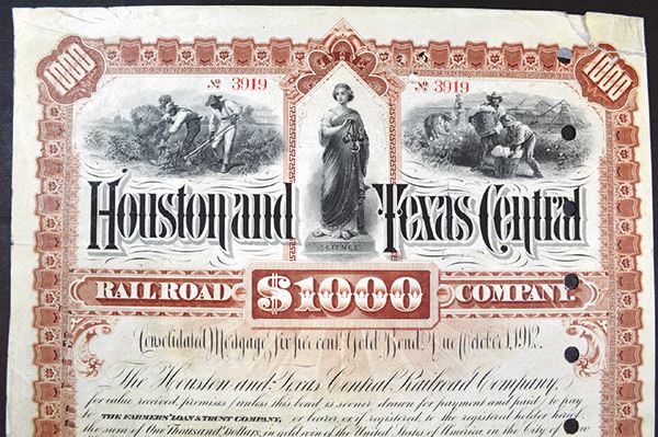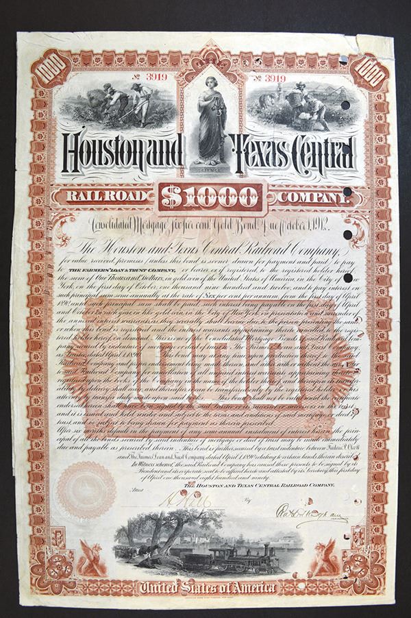 Texas. $1000 6% Gold Coupon Bond. Issued. Cancelled. ABNC. POCs. Rough top edge. Cotton Picking vignette. Fine.