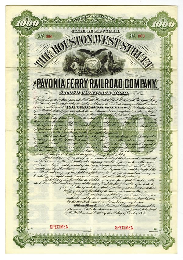 New York, $1000, Specimen 2nd Mortgage, 6% Coupon Bond, Black on olive green border and under print, New York Arms top center, Specimen overprints, POC's, The railroad is listed in Cox but no previous stock or bond certificates are known from this railroad except for this one. 3 found in archives. Extremely rare New York City railroad.