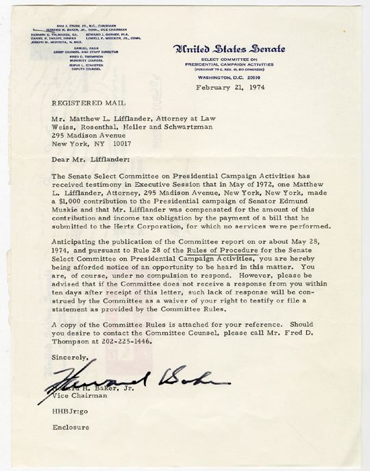 Washington, D.C......, 1974. Typewritten letter and accompanying postal cover from Howard H. Baker, Jr., on United States Senate, Select Committee on Presidential Campaign Activities letterhead. The letter is addressed to Matthew L. Lifflander, and discusses testimony about his $1,000 contribution to Senator Edmund Muskie's Presidential campaign. The testimony was received by the Senate Select Committee on Presidential Campaign Activities during an Executive Session, stating that "Lifflander was compensated for the amount of this contribution and income tax obligation by the payment of a bill that he submitted to the Hertz Corporation, for which no services were performed." A copy of the Committee Rules was included for Lifflander's reference. Signed at bottom by Howard H. Baker Jr., Vice Chairman. Howard Henry Baker Jr. (November 15, 1925 - June 26, 2014) was an American politician and diplomat who served as a United States Senator from Tennessee from 1967 to 1985. During his tenure, he rose to the rank of Senate Minority Leader and then Senate Majority Leader. A member of the Republican Party, Baker was the first Republican to be elected to the US Senate in Tennessee since the Reconstruction era. Known in Washington, D.C., as the "Great Conciliator", Baker was often regarded as one of the most successful senators in terms of brokering compromises, enacting legislation, and maintaining civility. For example, he had a lead role in the fashioning and passing of the Clean Air Act of 1970 with Democratic senator Edmund Muskie. A moderate conservative, he was also respected by his Democratic colleagues. Baker sought the Republican presidential nomination in 1980 but dropped out after the first set of primaries. From 1987 to 1988, he served as White House Chief of Staff for President Ronald Reagan. From 2001 to 2005, he was the United States Ambassador to Japan.