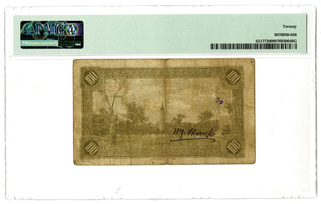 China, ND (1921), 100 Coppers, S/M#J1-43, Olive gray, Building in middle, back with pagoda in middle, S/N 2446683, PMG graded Very fine 20. Only 7 notes graded in the PMG census and the first time we have offered and example of this note. No examples have been offered at auction in the last 3 years.