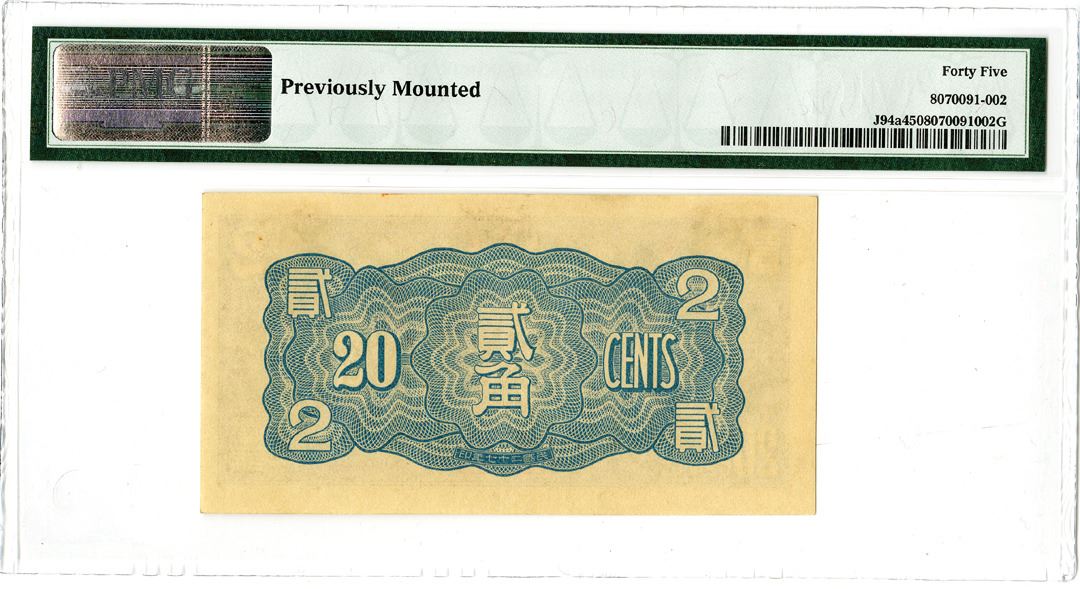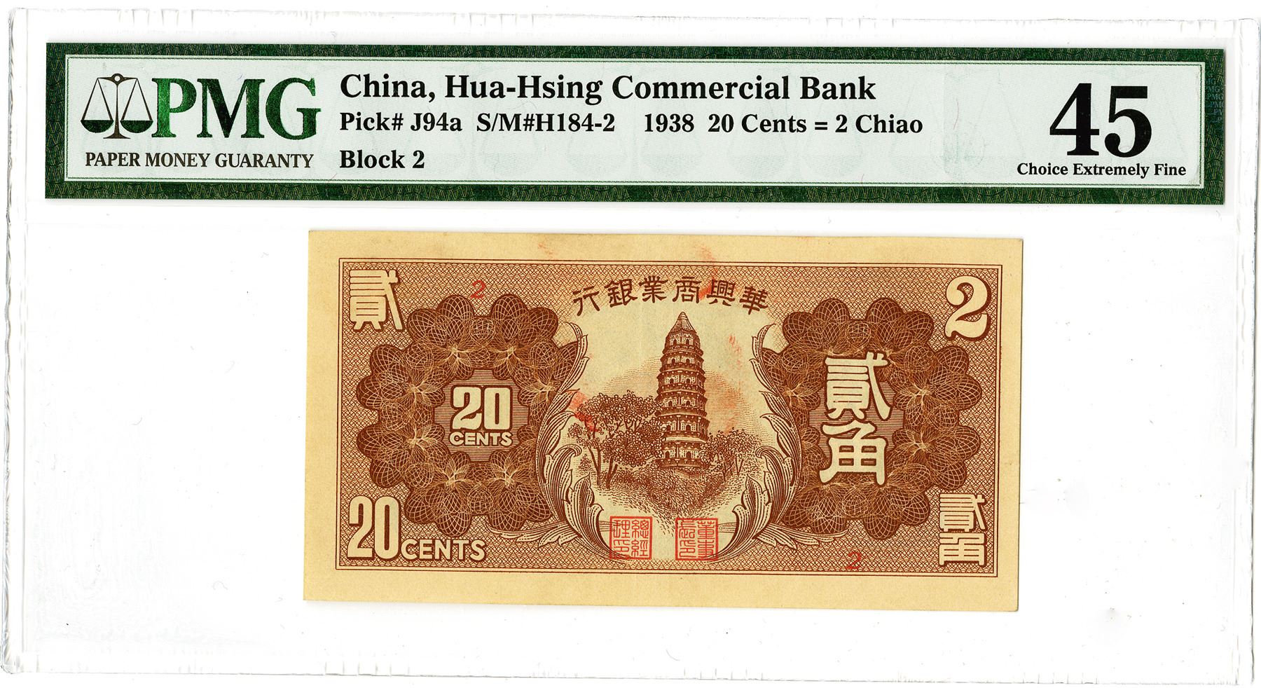 China. 20 Cents = 2 Chiao, P-J94a, S/M#H184-2, Issued banknote. Tied with the finest note offered at auction. Only 2 other notes have graded higher. Rare and desirable note an first time offered by us.
