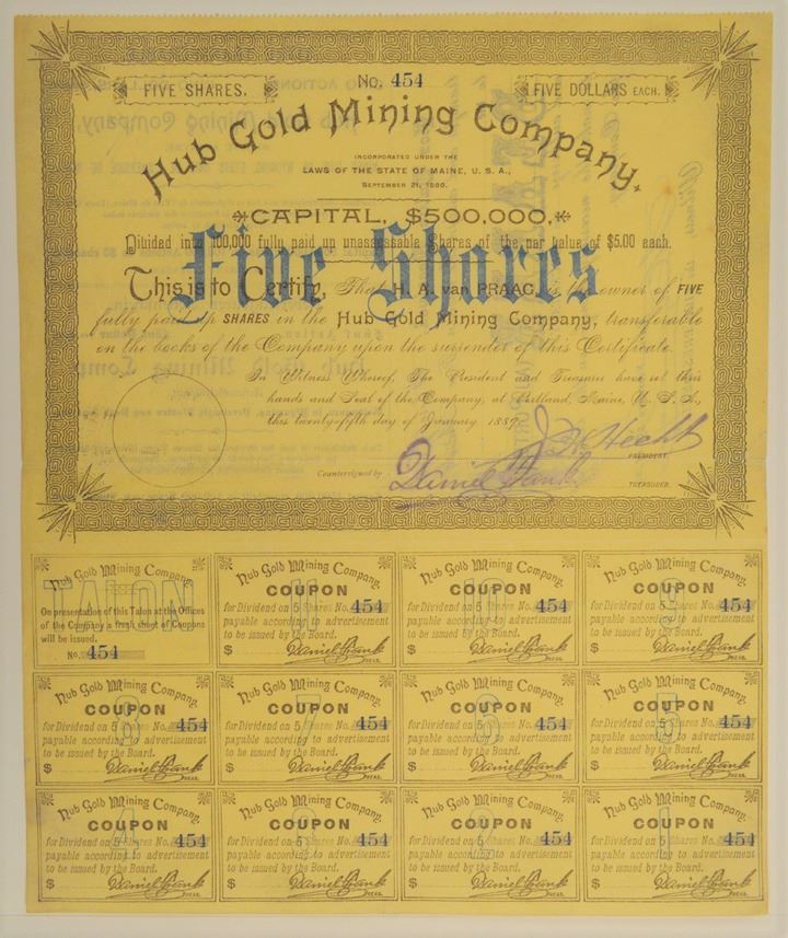 Maine. 5 Shares Capital Stock I/U Certificate, Black print on black border and blue under tint, Company title at top with dividend coupons at bottom, Fine-VF condition, .