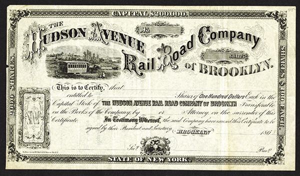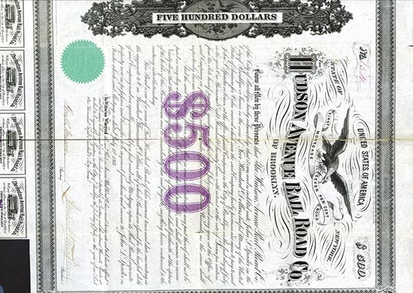 New York. Stock Certificate Remainder with probably a false 1863 date filled in; $500 Bond Issued, with five coupons remaining. Split along the quarter fold with old tape repair partially on the back holding it together. Large format. The Stock has a nice view of the Horse car. 2 pieces. (From the John E. Herzog Collection)