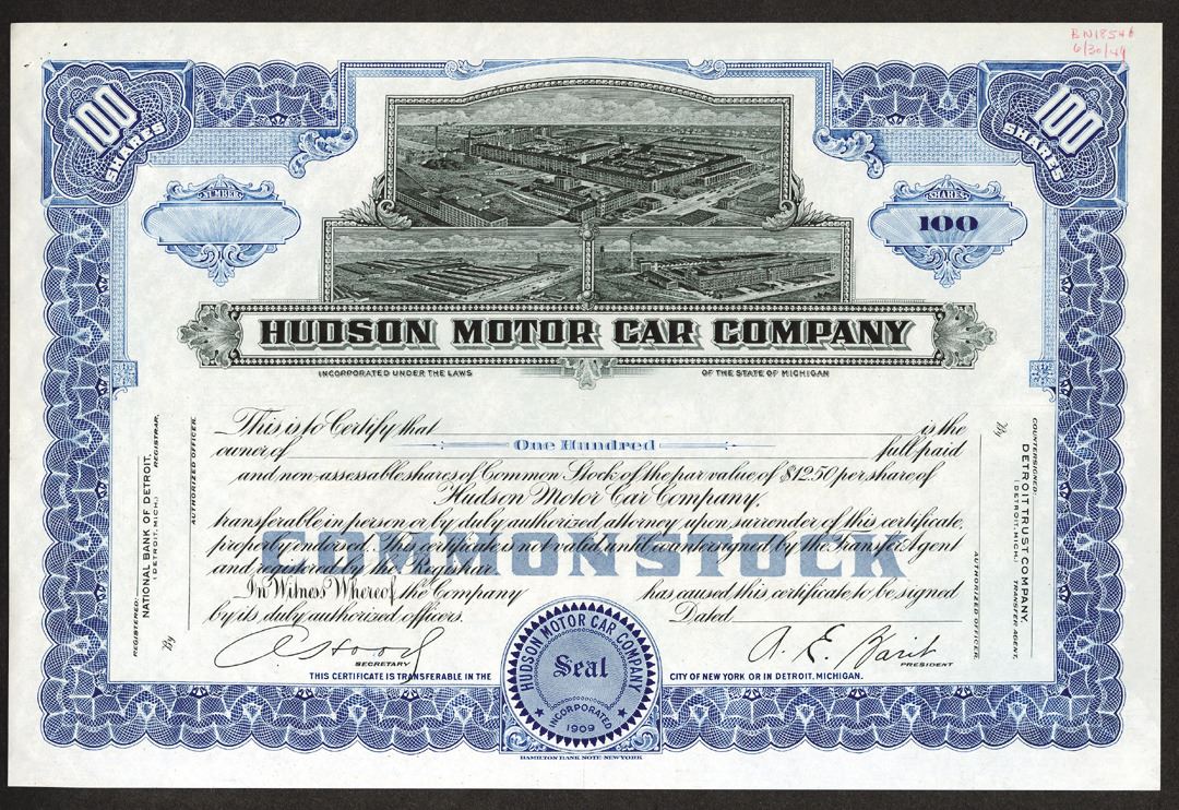 Michigan, 1949, 100 Shares, Specimen, Black on blue border and underprint, 3 factory vignettes top center, VF-XF condition, HBNC.
