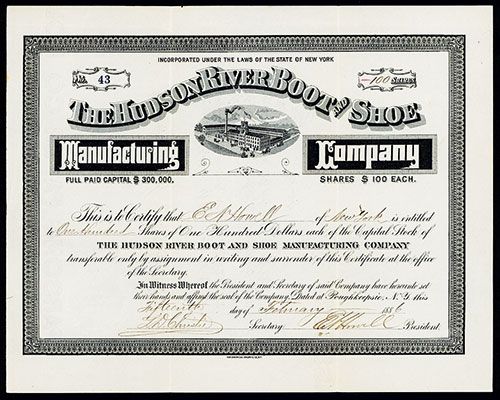 New York, 1886, I/U Stock, 100 Shares, #43, Black print with black ornate border, Manufacturing building top center, VF condition, American Graphic Co.