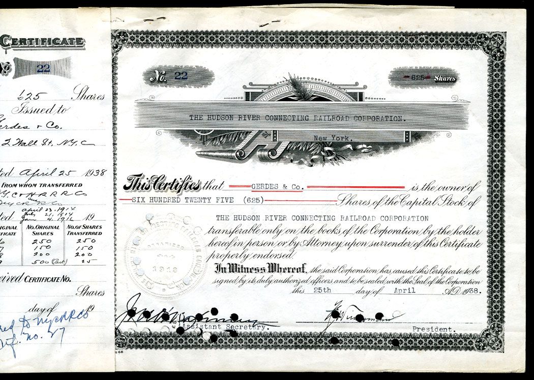 New York, 1938, Hudson River Connecting Railroad Corp. 625 Shares, Capital, Stock Certificate, VF Condition. Generic certificate.