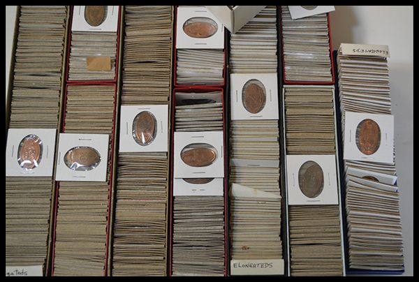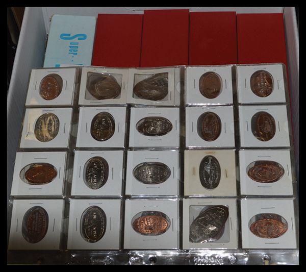 Huge Box Lot of Elongated Coins. Cents, Nickels, Dimes, Quarters, Half Dollars and some World Coins. Everything from Mickey Mouse to Marilyn Monroe. Eleven single row boxes, seventeen album pages, and a plastic bag loaded with hundreds more elongated coins. A huge assortment, and a nice mixture of common and scarcer pieces. A quick glance reveals numerous 1939 New York World’s Fair pieces, including some struck on Civil War store cards, Panama Pacific 1915 Expo, 1904 Louisiana Purchase, and many others. Must be seen. Sold as is. Perhaps 1,000+ pieces.